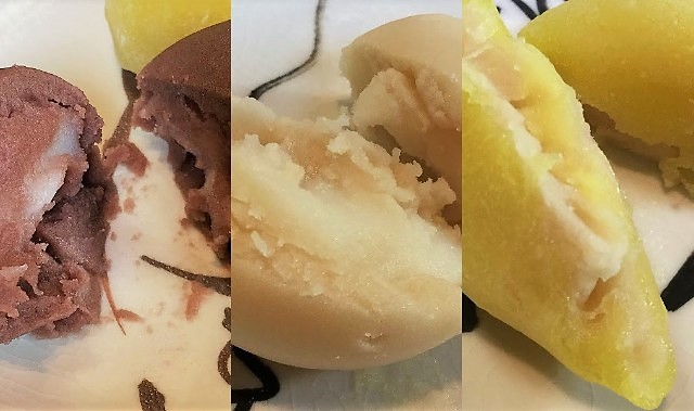 米粉の団子を十勝産小豆で包んだ団子(赤)、米粉の団子を白餡で包んだ団子(白)、弾力のある餅状の生地にみそ餡を包んだ団子(黄)。