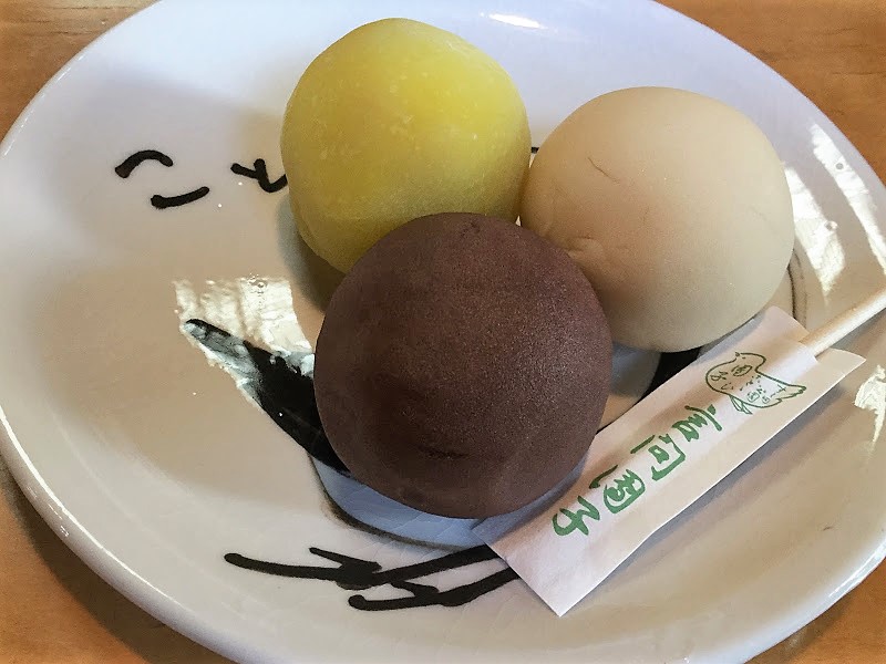 シンプルな黄色、白、小豆の3つ団子。串にささっておらず、楊枝で食べる。