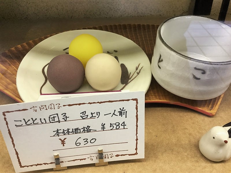 イートインメニューとして、「言問団子」と「言問最中」の2種類が入り口にディスプレイされていた。今回は2人で行ったので、1種類ずつ注文しようと思ったが、席について数分で言問団子とお茶のセットが運ばれてきた。