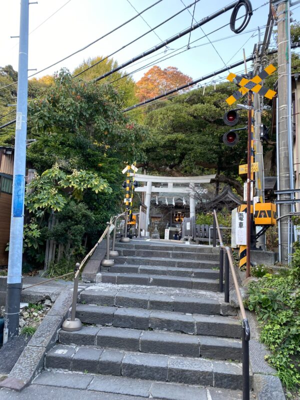 メインの鳥居の目の前は江ノ電の踏切で、鳥居の目の前を江ノ電が走る。
